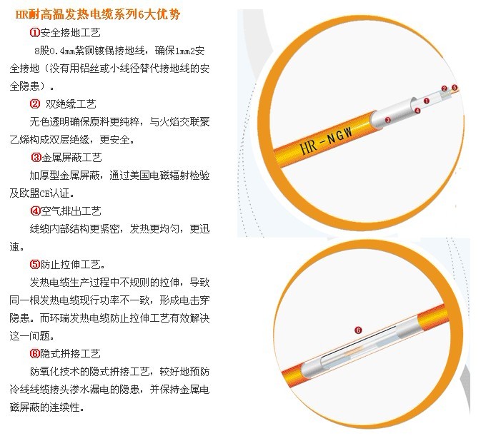 安徽環(huán)瑞采用新的雙絕緣工藝耐高溫的發(fā)熱電纜,包括有發(fā)熱合金,所述的發(fā)熱合金外依此包覆無色透明氟隆絕緣層、火焰及蒸汽交聯(lián)聚乙烯絕緣層、8*0.4mm鍍錫紫銅絲接地、加厚型金屬電磁屏蔽,阻燃型PVC外護(hù)套使用方便安全,壽命長,適用于高溫環(huán)境下的輻射供暖。