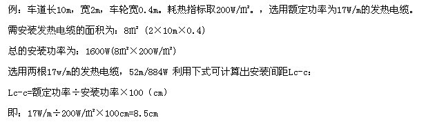 關(guān)于車道融雪化冰,為節(jié)省出資,不用在車道整個區(qū)域鋪設(shè)加熱電纜,通常裝置在車輪通過的當?shù)鼐妥銐蛄恕?蛇x用單位裝置面積功率為200~250W/㎡,并選用帶地上傳感器的溫控器來操控。