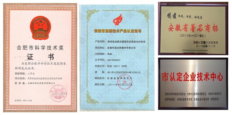 安徽環(huán)瑞擁有21項(xiàng)自主知識(shí)產(chǎn)權(quán),其中包括:2項(xiàng)國(guó)家發(fā)明專利;4項(xiàng)新型電伴熱帶、發(fā)熱電纜生產(chǎn)核心技術(shù)(1、雙層共擠技術(shù),2、束代絞預(yù)恒張力絞線,3、一體化熱線冷線隱式拼接,4、三層共擠技術(shù));5項(xiàng)核心新型產(chǎn)品(1、具有低電阻過渡層的電伴熱帶,2、一種安全塑料體的電伴熱帶,3耐高溫耐磨的發(fā)熱電纜,4、太陽(yáng)能熱利用電伴熱帶,5、新型長(zhǎng)距離并聯(lián)、串聯(lián)恒功率電熱帶);10項(xiàng)行業(yè)專用電伴熱帶(消防專用電伴熱帶、電廠煙氣脫硫?qū)S秒姛釒А⑻?yáng)能熱水器本質(zhì)安全型電熱帶、石油管道伴熱專用電熱帶、汗蒸房專用電熱帶、天溝融雪專用發(fā)熱電纜、混凝土養(yǎng)護(hù)專用發(fā)熱電纜、畜牧養(yǎng)殖專用發(fā)熱電纜等)。安徽環(huán)瑞憑借此項(xiàng)榮譽(yù)獲得了省科學(xué)技術(shù)獎(jiǎng)、高新技術(shù)產(chǎn)品證書及國(guó)家地暖行業(yè)、省建設(shè)廳榮譽(yù)推廣證書。