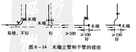4.安裝時(shí)應(yīng)該注意末端立管和干管的接法,避免因泥砂堵塞造成最后一根立管上的加熱盤(pán)管堵塞,見(jiàn)圖6一14所示。