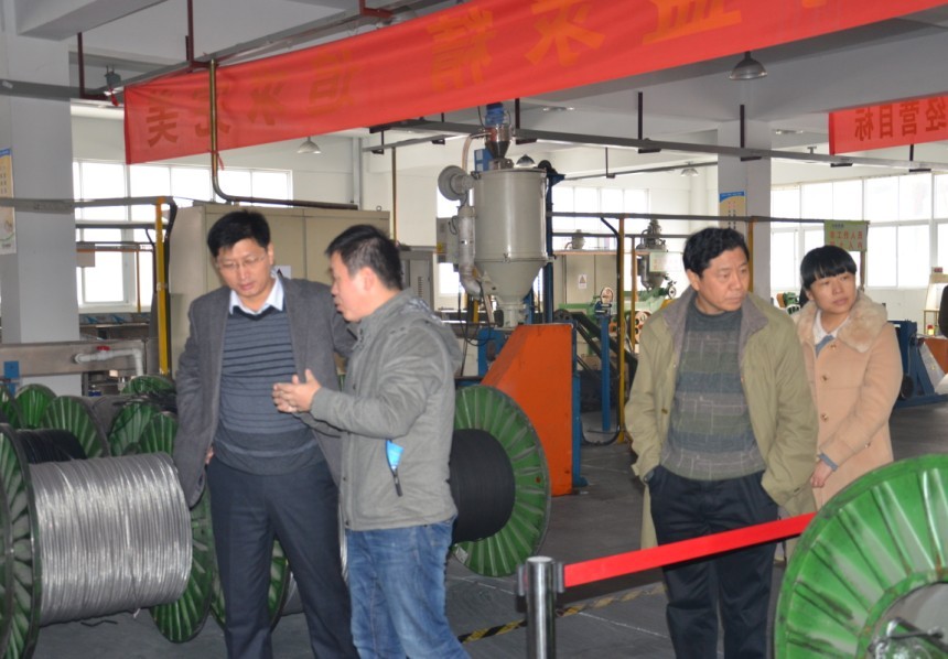 縣委孫書記、開發區領導仔細聆聽計總介紹關于我司自限溫電熱帶,恒功率電伴熱帶生產工藝流程