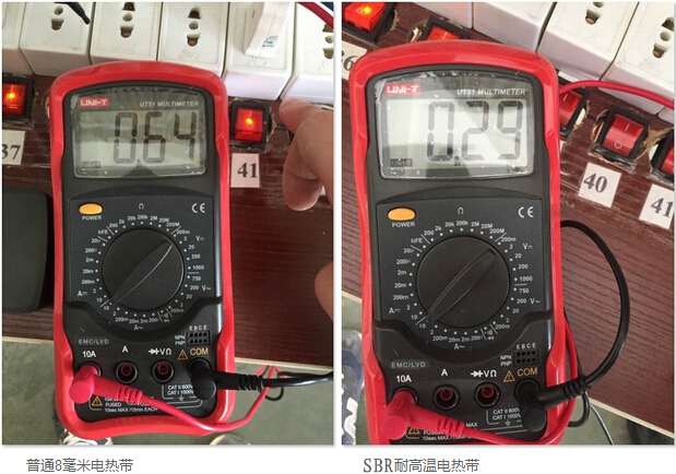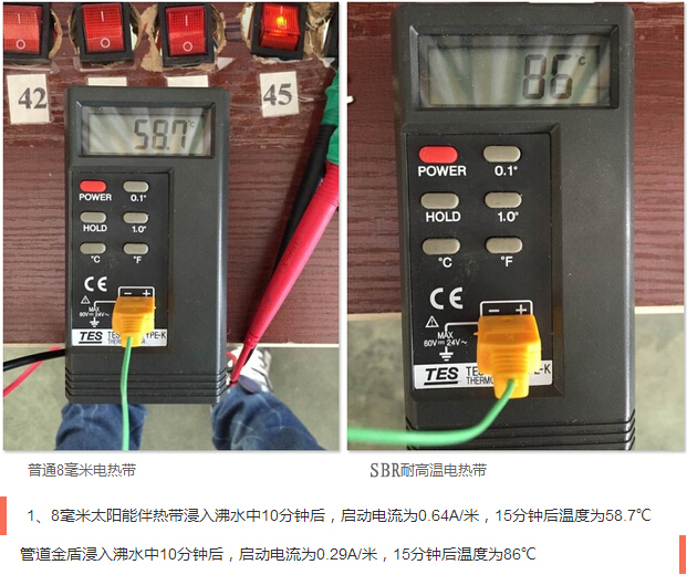 SBR型耐高溫電伴熱在模擬沸水管道狀態(tài)下使用后,啟動(dòng)電流基本無(wú)變化,產(chǎn)品性能更加穩(wěn)定,有效地降低了伴熱帶起火燃燒的概率,提高了使用壽命,發(fā)熱溫度更高,更適合太陽(yáng)能管道伴熱。