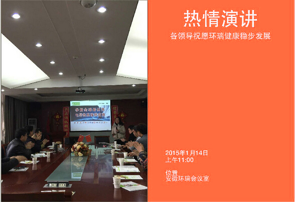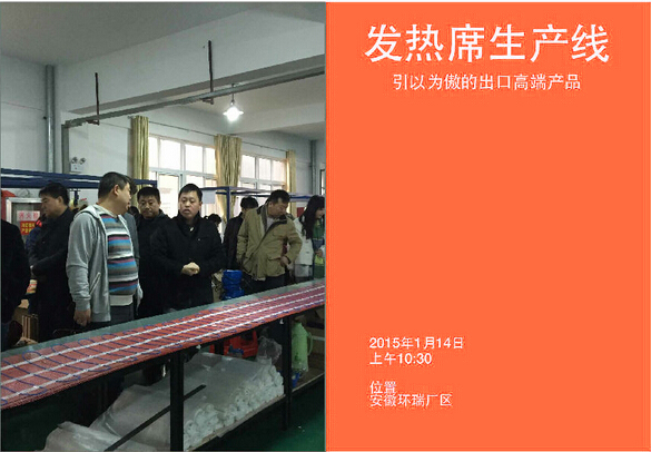 2015年1月14日新年伊始,環(huán)瑞迎來了新疆烏蘇市相關(guān)領(lǐng)導(dǎo)蒞臨考察,烏蘇市相關(guān)領(lǐng)導(dǎo)在環(huán)瑞董事長計成志陪同下參觀了環(huán)瑞電伴熱帶、發(fā)熱地席和環(huán)瑞現(xiàn)代化展廳,并在環(huán)瑞會議時聽取環(huán)瑞員工對環(huán)瑞未來發(fā)展的相關(guān)介紹。