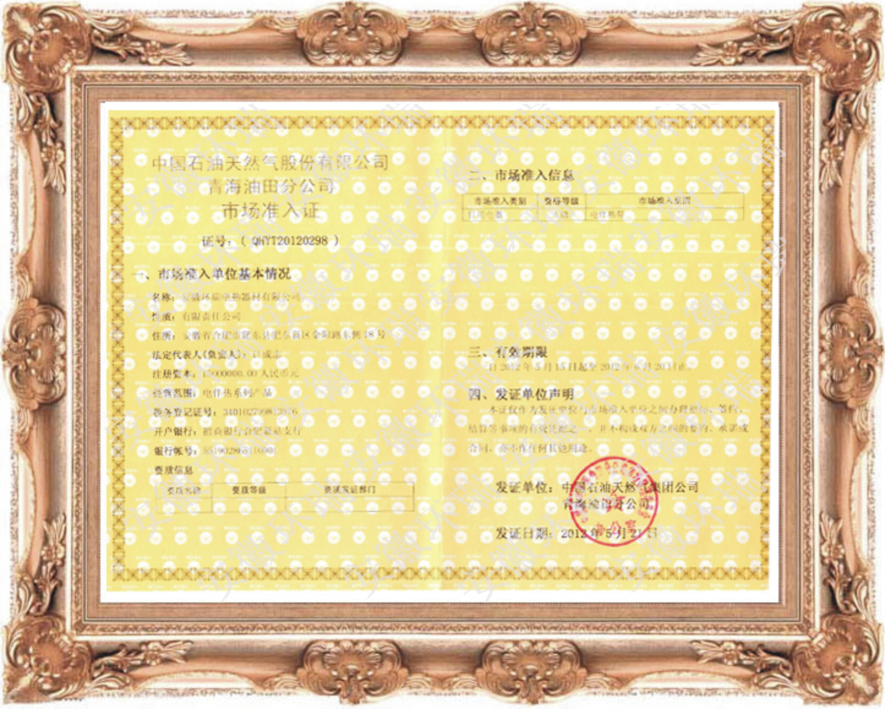 安徽環(huán)瑞獲得青海油田電熱帶物質準入證,這是針對地方油田的第二道門檻。迄今為止,我司通過長期貿易往來,中標的方式獲得了大慶油田,克拉馬依油田,華北油田,遼河油田等中石油旗下子公司的電熱帶準入證。并與2011年4月初,獲得中國石油天然氣集團公司物資供應商一級準入證。《物資供應商準入證》是與中石油總部管理的旗下全資子公司、直屬企業(yè)和事業(yè)單位具有同等的供貨準入證,供應商可在準入產品范圍內向中石油天然氣集團公司供貨。