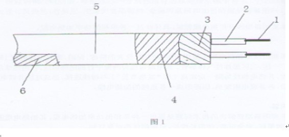參見圖1,一種單相恒功率電伴熱帶,包括有二個電纜內芯,其特征在于:每個電纜內芯分別由一根鍍錫銅絞線組成,1、每根線芯分別包覆有芯線絕緣層氟塑料2、二個芯線絕緣層外依次包覆有發熱絲3、骨架層4、絕緣護套氟塑料5、金屬屏蔽網6和加強防腐護套氟塑
