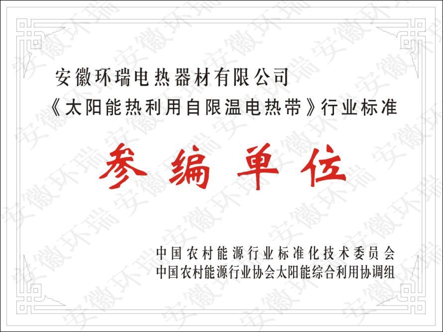 安徽環(huán)瑞電熱器材有限公司長(zhǎng)期致力于自限溫電伴熱帶在各行業(yè)的應(yīng)用,尤其是太陽能專用自限溫電伴熱帶,并研發(fā)出一種安全節(jié)能的太陽能電伴熱帶-納米阻燃本質(zhì)安全型電熱帶,獲得了國(guó)家專利證書和省高新技術(shù)產(chǎn)品,針對(duì)目前國(guó)內(nèi)層次不齊的電熱帶質(zhì)量,為了規(guī)范太陽能電熱帶的市場(chǎng),提高產(chǎn)品的質(zhì)量。安徽環(huán)瑞與多家電伴熱同行企業(yè)共同起草《太陽能熱利用自限溫電熱帶》,此標(biāo)準(zhǔn)由中國(guó)農(nóng)村能源行業(yè)協(xié)會(huì)提出。能源行業(yè)農(nóng)村能源標(biāo)準(zhǔn)化技術(shù)委員會(huì)歸口,是專門針對(duì)太陽能行業(yè)的自限溫電熱帶標(biāo)準(zhǔn),具有重要意義。